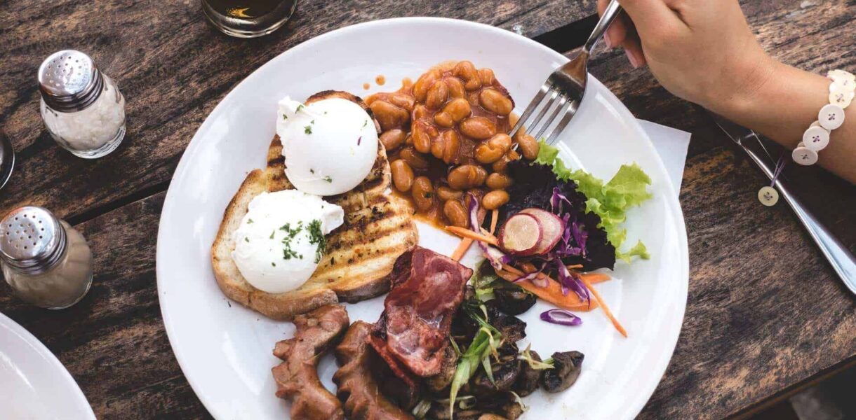 Eating high protein brunch with poached eggs, beans and bacon